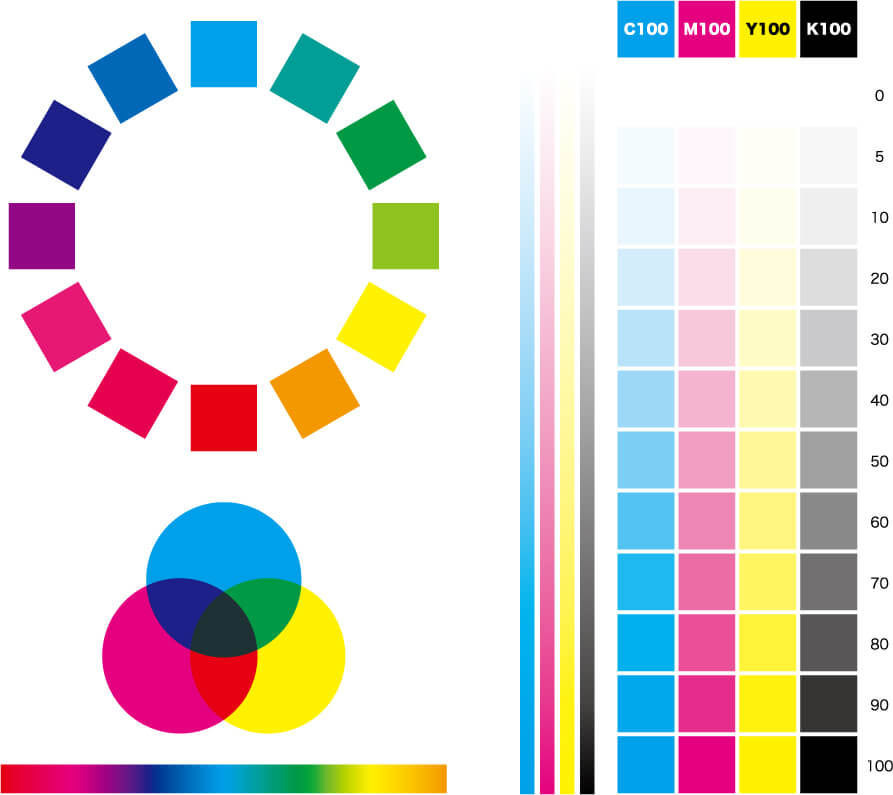 パソコンで見る色と印刷をした時の色が微妙に違うなと感じたことはありませんか。まず色の表現には2種類あります。テレビなど光で出せる色「RGB」とインクで出せる色「CMYK」です。そんな細かい違いなんて考えたことない・・・確かに日常生活では意識していないことですが、チラシや広告、パンフレットなどを作成する時、パソコンで作成した色と違う・・・。そこで色の仕組みについて簡単に知識として知っておきましょう。