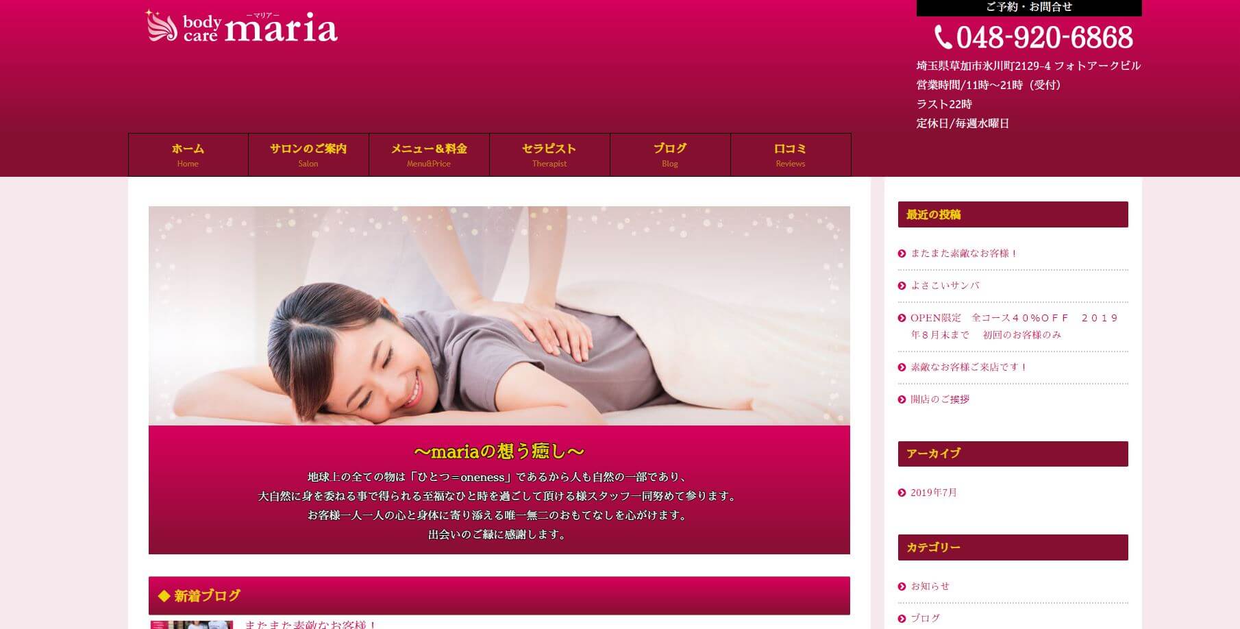 body care mariaさま ホームページ制作Web 2019.08.09 2019.07.29草加駅西口から徒歩2分! お客様に至福のひとときを過ごしていただきたい・・・オーナー様の願いがこもった素敵なお店です。 ぜひ日頃の疲れをボディケアmaria様で癒して下さい。https://bodycare.life/