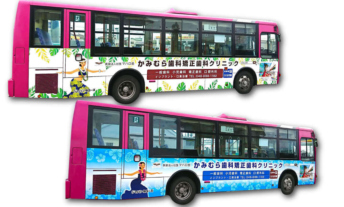 かみむら歯科矯正歯科クリニック様 バスラッピング制作バス広告 2021.05.17 2017.12.25かみむら歯科様バスフルラッピングかみむら歯科矯正歯科クリニック様 南越谷~レイクタウン周辺の路線バスの車体全体に広告シートを制作いたしました。とても素敵なデザインになりました。かみむら歯科矯正歯科クリニック様は、予防歯科を中心に痛くない歯科治療や口臭治療に注力しています。24h予約可能(ネット)ですし、保育士さんがお子様をお預かりするサービスもあるのでゆっくり安心して治療もできます。