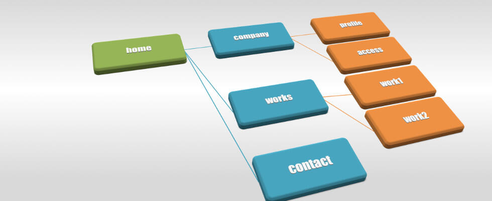 例えば、トップページ、商品紹介、口コミ、お問合せ、店舗紹介、アクセスなど大きい項目とさらに、その中で枝分かれした小さいページで作られています。